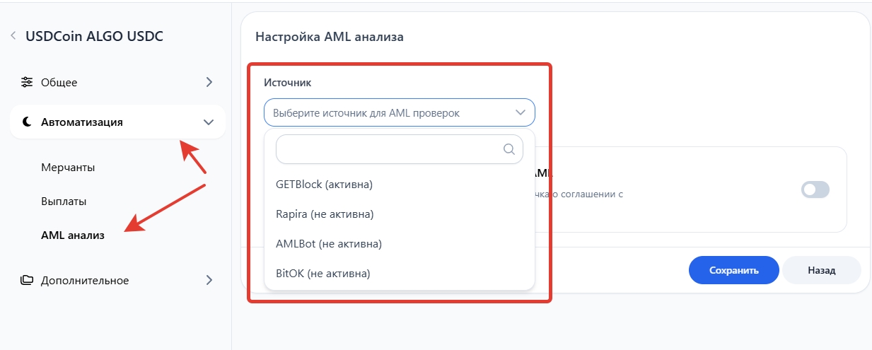 Перейдите в раздел "Автоматизация — AML Анализ" и в списке "Источник" выберите сервис