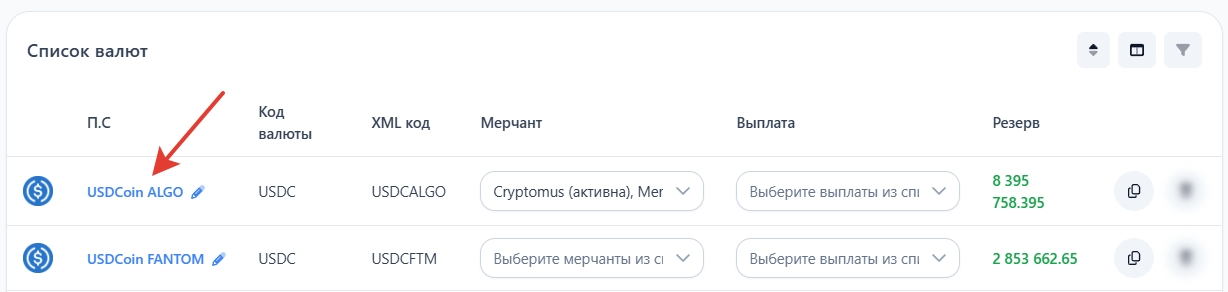 В панели управления откройте раздел "Основное — Валюты — Список валют" выберите валюту для которого хотите активировать AML Сервис и перейдите к редактированию нажав на название.