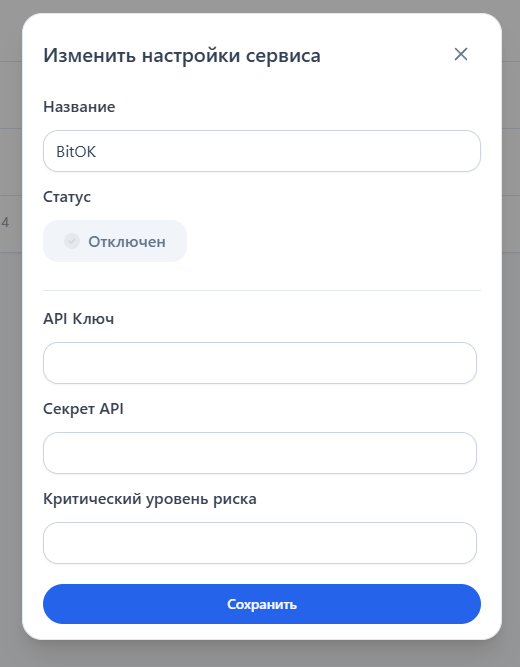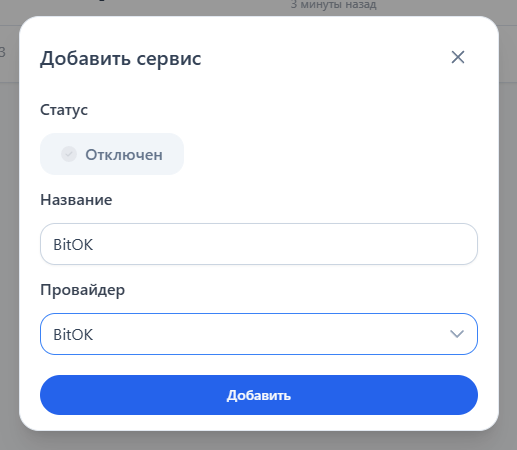 Если не добавлен сервис **"BitOK"**, нажмите кнопку **"Добавить сервис"** и выберите из списка **"Bitok"**