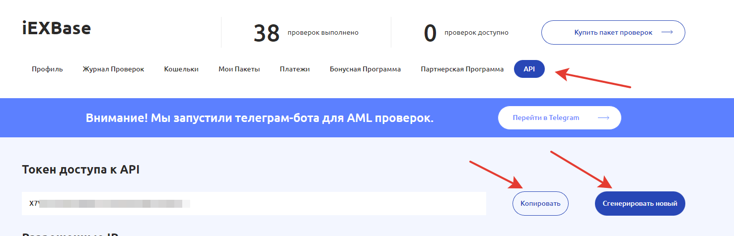В личном кабинете, откройте раздел API и в блоке Токен доступа к API сгенерируйте ключ API.