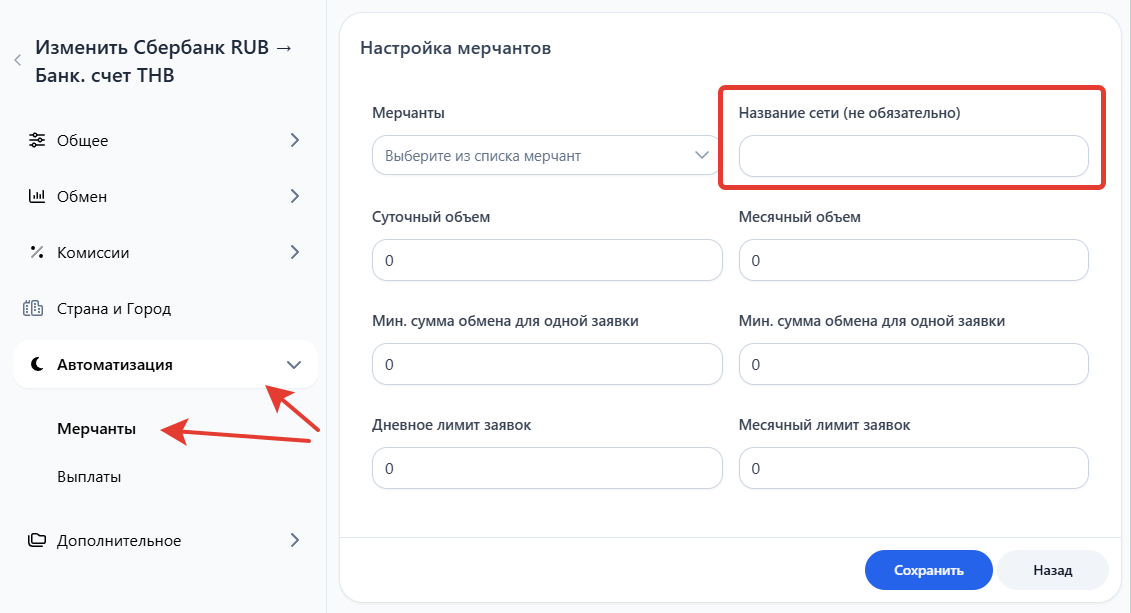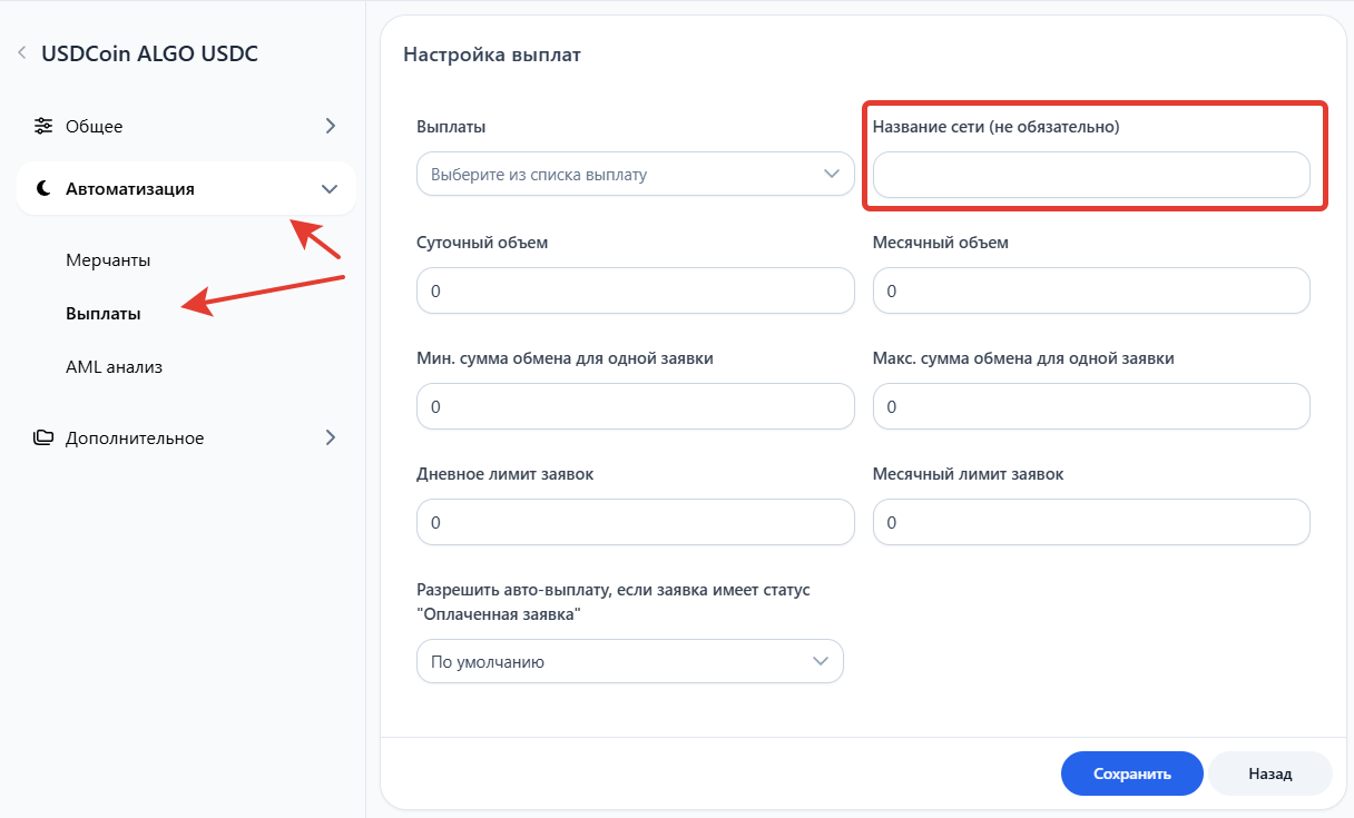 Откройте раздел "Автоматизация — Выплаты" и пропишите в поле "Название сети (не обязательно)" значение для определения сети к которому относится настраиваемая валюта. (Например: usdt-tron, usdttrc ...)