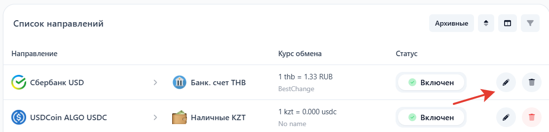 В списке найдите нужное направление обмена и нажмите на него, чтобы открыть настройки редактирования.