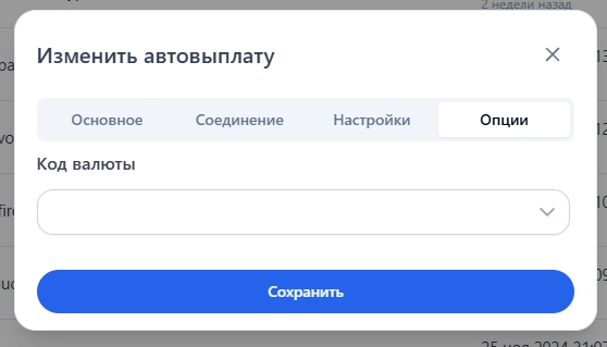 Код валюты — выберите из списка код, (Будет доступна только после установки соединения с ABCEX)