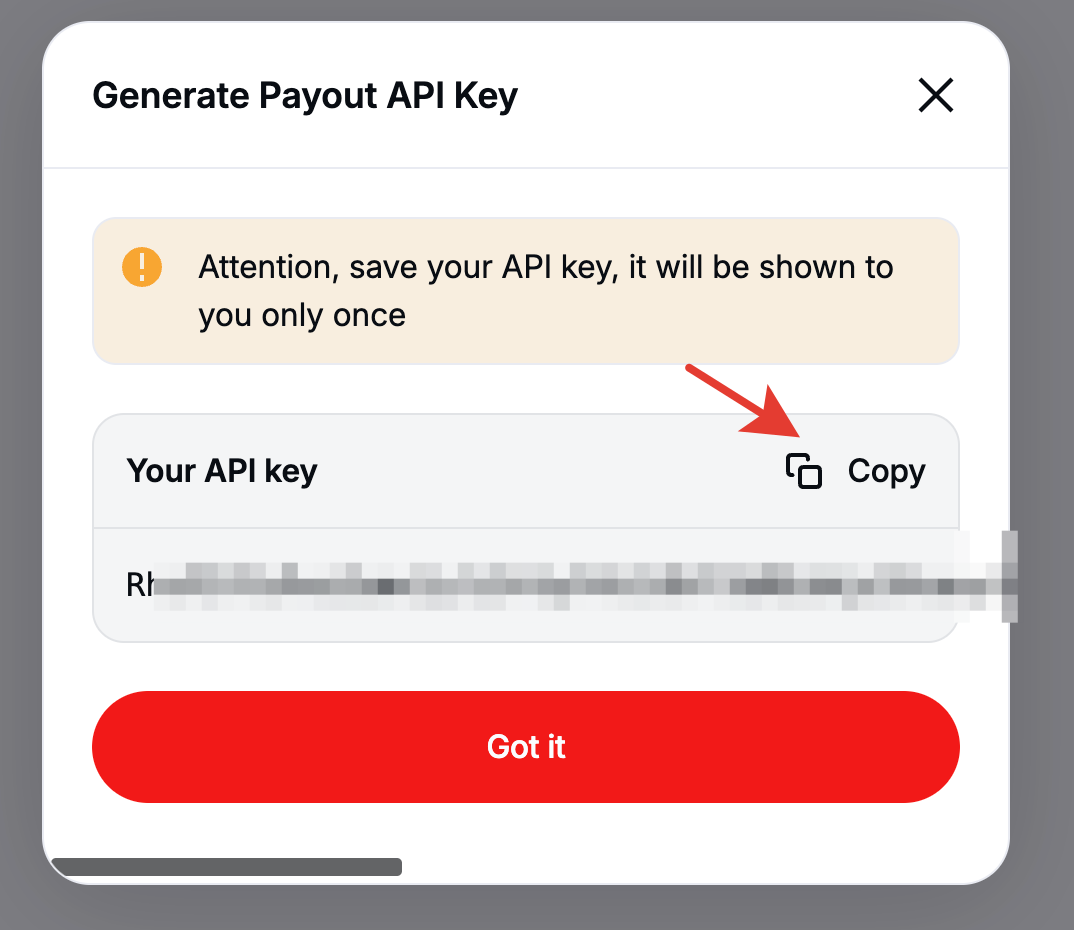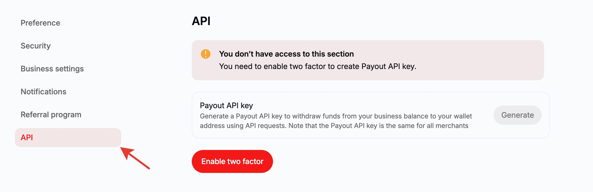 Обратите внимание, что вывод средств будет временно заблокирован (на 24 часа) после создания или перегенерации API ключа для выплаты.