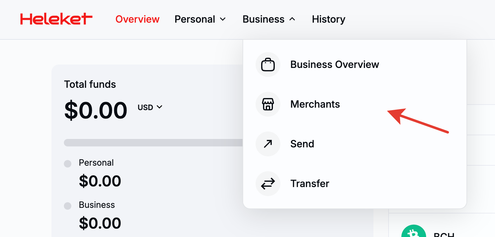 Отправьте заявку на регистрацию мерчанта нажав "Leave a request"