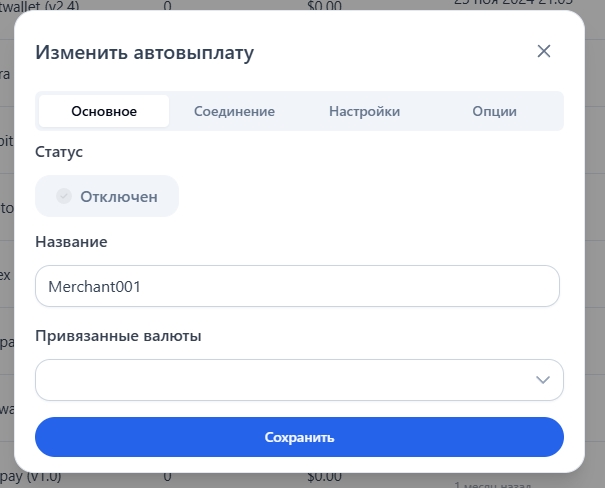В панели управления откройте раздел "Мерчанты и API — Список автовыплат", и справа в углу нажмите кнопку "Добавить выплату"