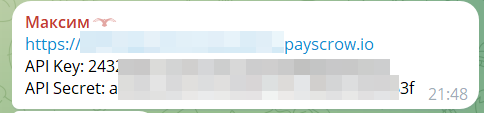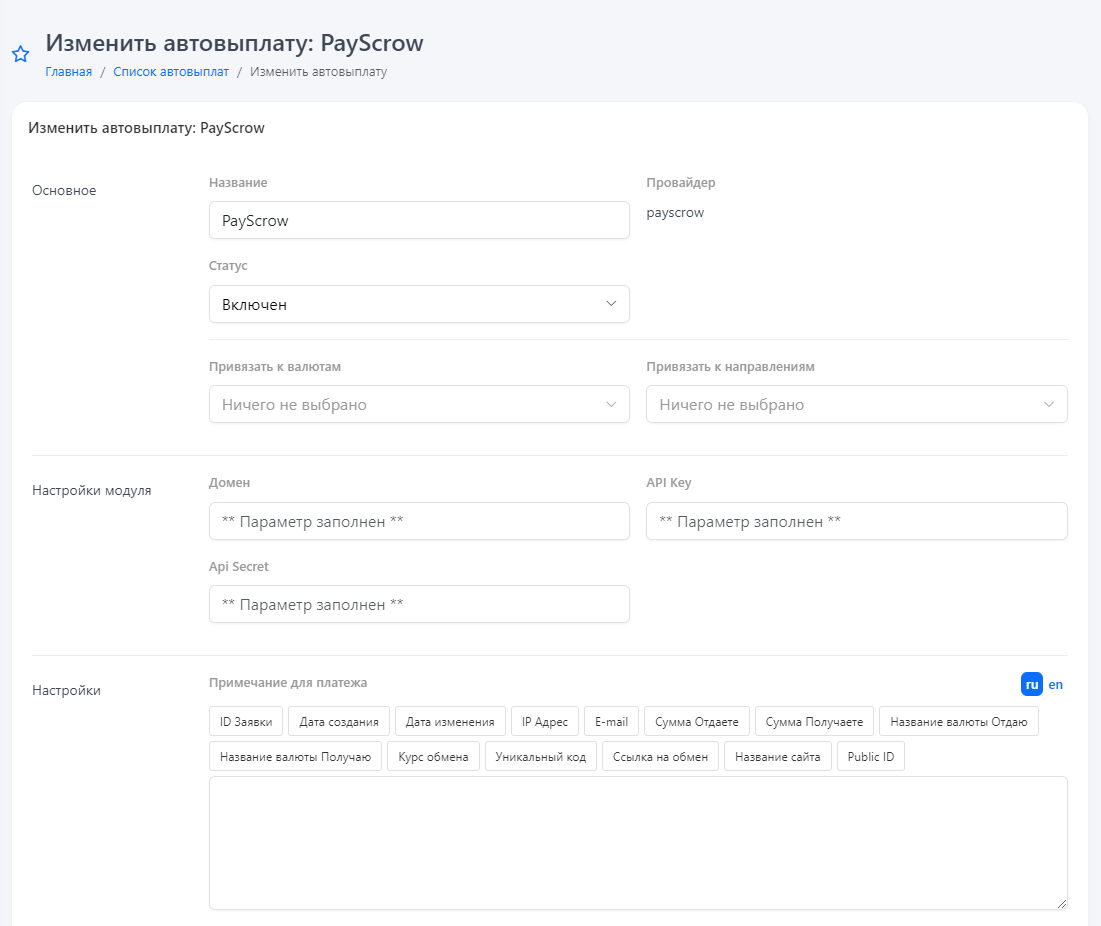 * **Домен** — домен, выданный службой поддержки Payscrow