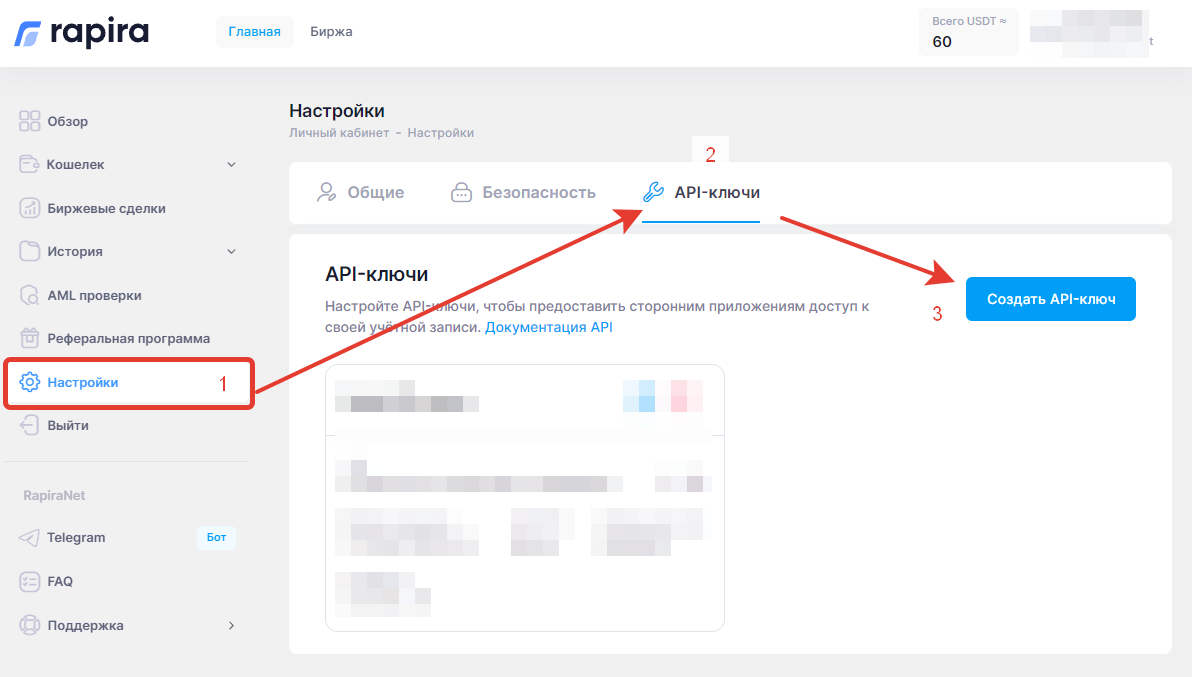 После выполнения процедур выше, откройте раздел **"Настройки"** и перейдите во вкладку **"API Ключи"**