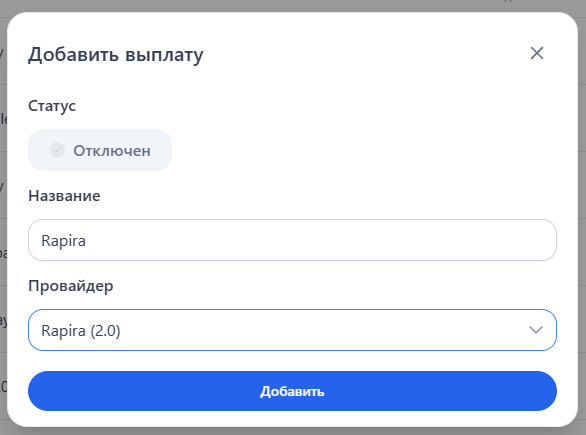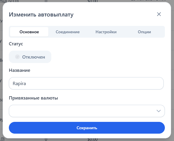 * **Валюта из которой будет конвертация —** укажите код (обычно это USDT), которая позволит выплачивать валюту без необходимости хранения на счетах Rapira