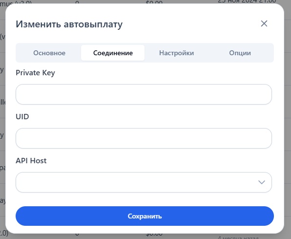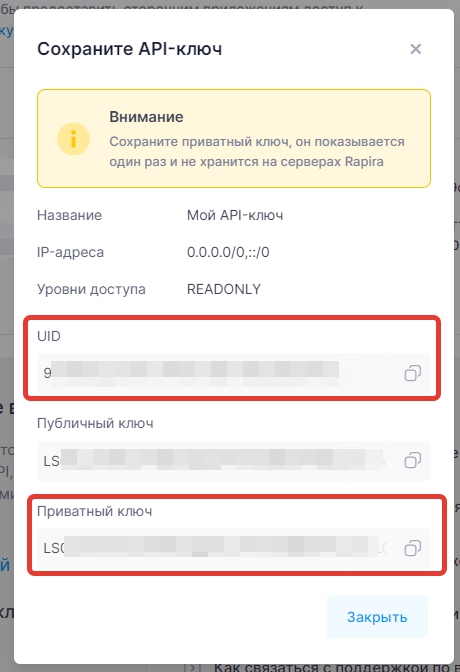 * **Private Key —** Приватный ключ которая выдается при создании API ключа