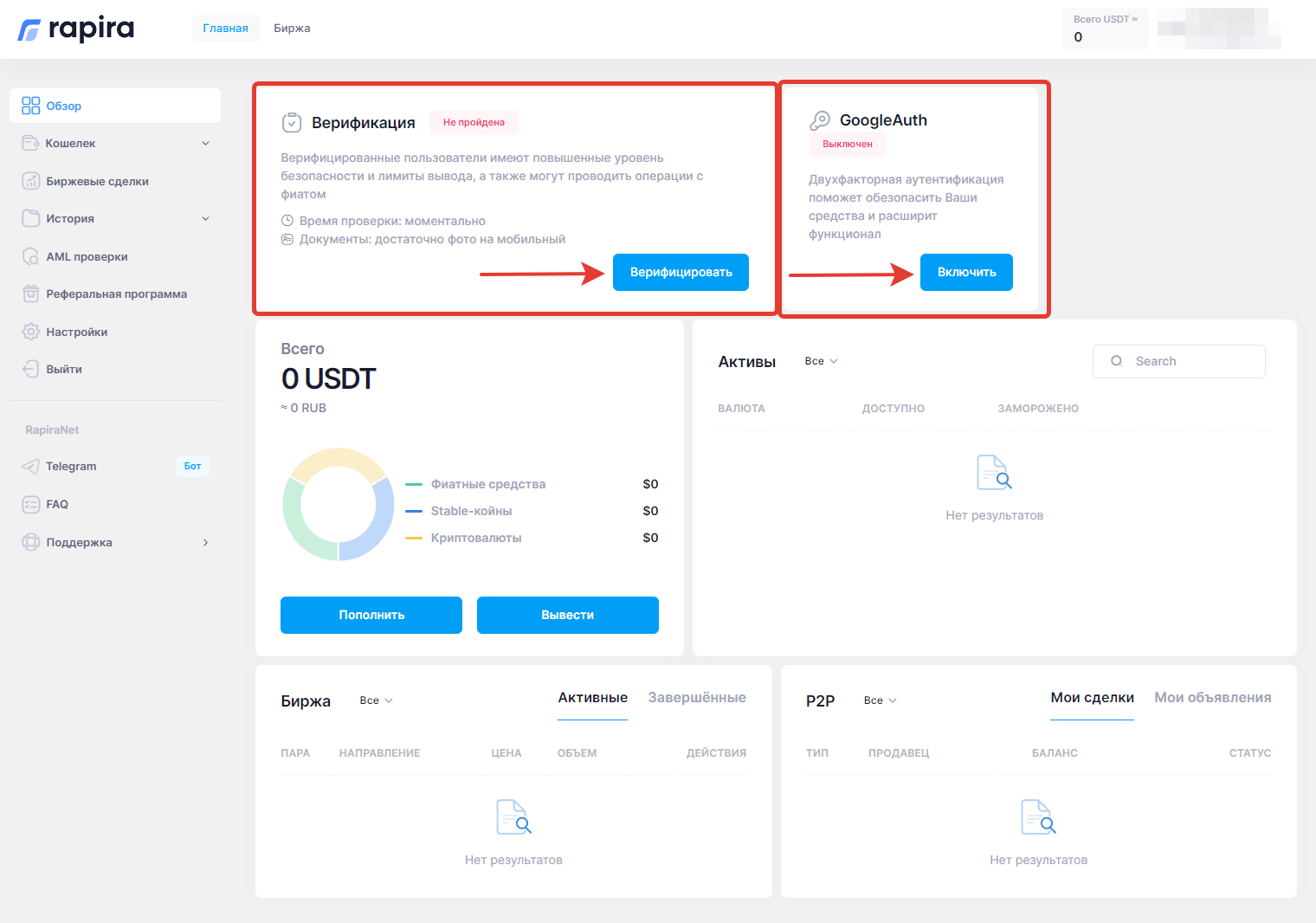 После авторизации, вы сразу попадете в раздел **"Обзор"**, где в первую очередь вам необходимо пройти верификацию а также активировать **Google Authenticator**.