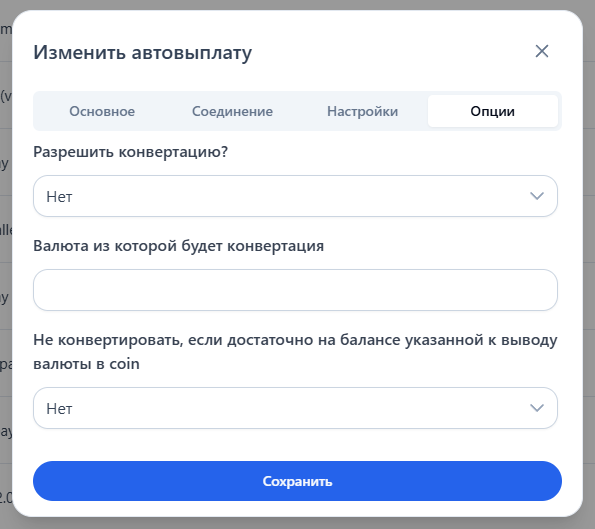 * **Не конвертировать, если достаточно на балансе указанной к выводу валюты в coin —** Если включена, то конвертация будет работать только в случае, если на балансе не хватает средств.
