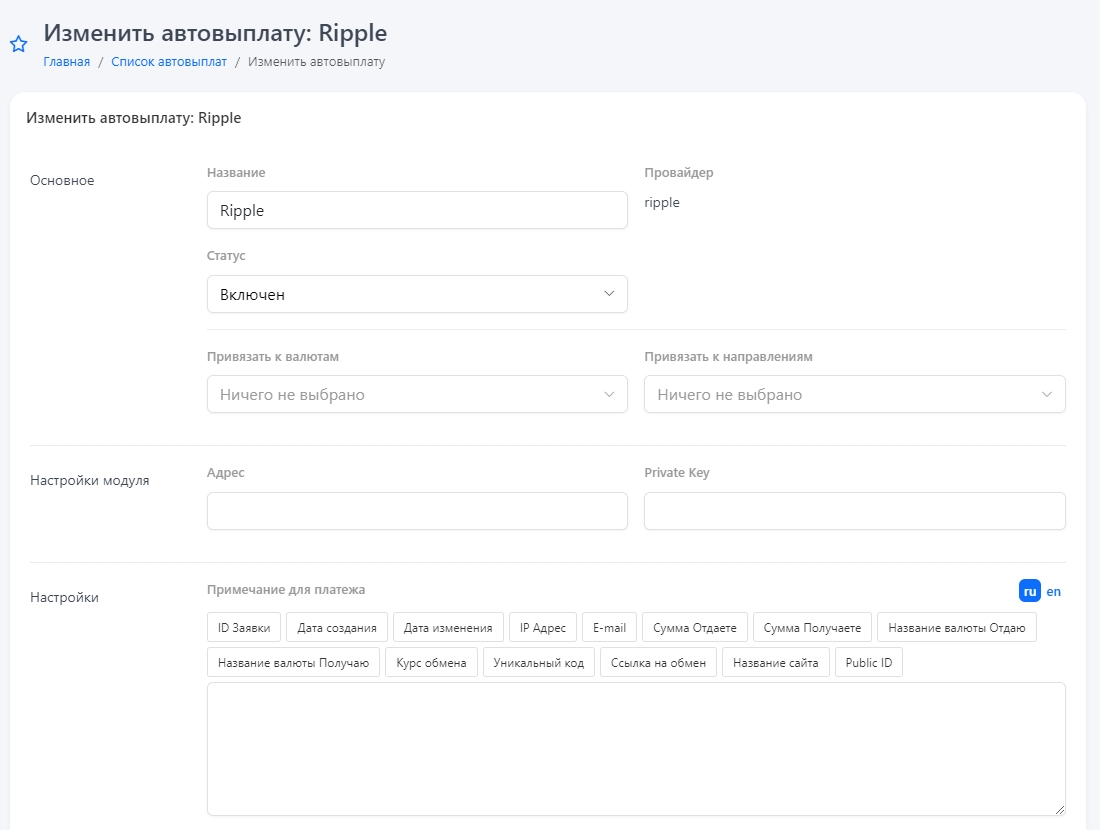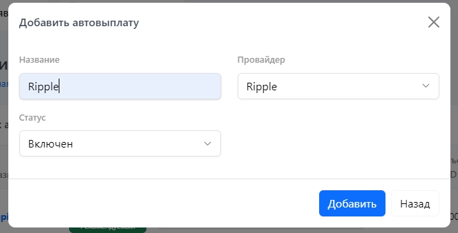 В панели управления откройте раздел "Мерчанты и автовыплаты — Список автовыплат", и справа в углу нажмите кнопку "Добавить автовыплату"