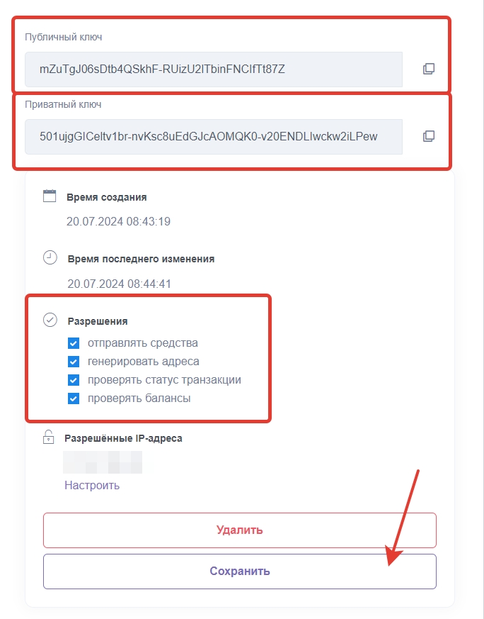 Публичный ключ — публичный ключ, сгенерированный при создании API ключа.