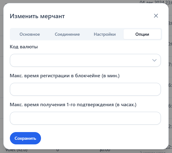 Макс. время регистрации в блокчейне (в мин.) — Максимальное время регистрации транзакции в сети (Рекомендуемое значение: 30)