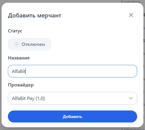 В панели управления откройте раздел "Мерчанты и API — Список мерчантов", и справа в углу нажмите кнопку "Добавить мерчант"