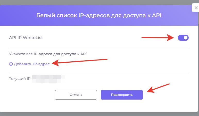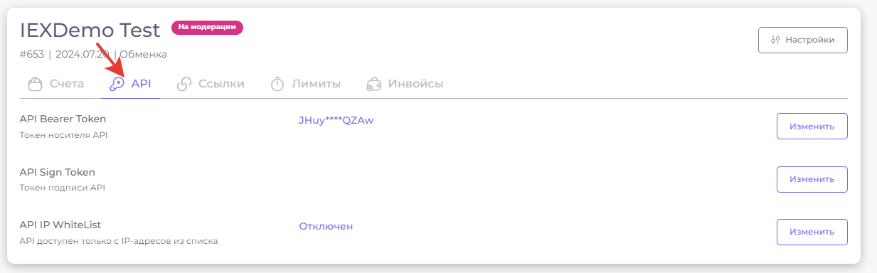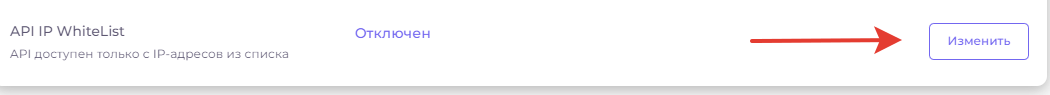 Для улучшения безопасности мерчанта, в разделе **"API IP WhiteList"** нажмите на **"Изменить"**&#x20;