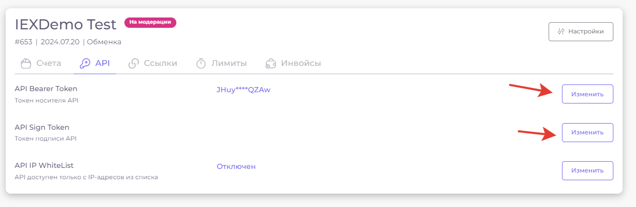 Обновите ключи "**API Bearer Token**" и "**API Sign Token**", нажав на кнопку **"Изменить"** (каждого пункта по отдельности)