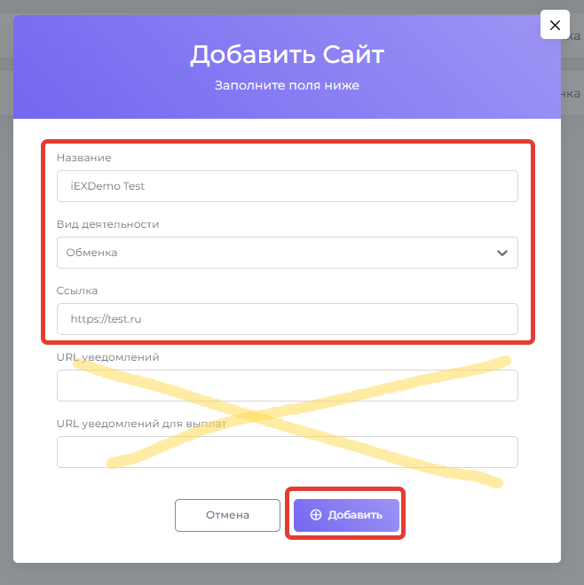Заполните представленную форму (За исключением **"URL уведомлений"** и **"URL уведомлений для выплат"**)