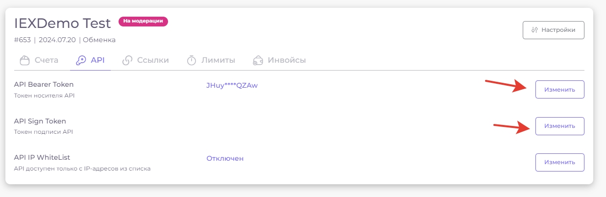 Обновите ключи "API Bearer Token" и "API Sign Token", нажав на кнопку "Изменить" (каждого пункта по отдельности)