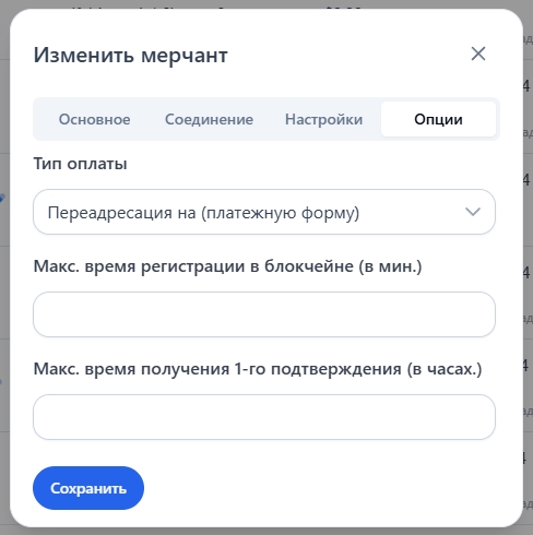 - Макс. время регистрации в блокчейне (в мин.) — Максимальное время регистрации транзакции в сети (Рекомендуемое значение: 30)