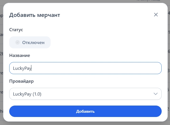 В панели управления откройте раздел "Мерчанты и API — Список мерчантов", и справа в углу нажмите кнопку "Добавить мерчант"