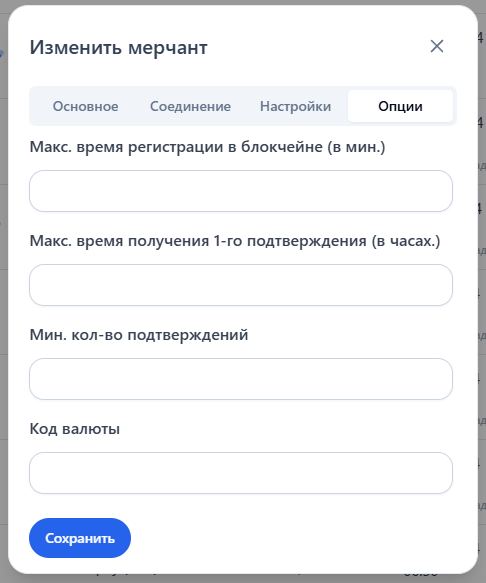 Макс. время регистрации в блокчейне (в мин.) — Максимальное время регистрации транзакции в сети (Рекомендуемое значение: 30)