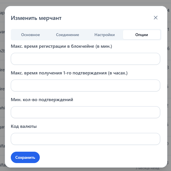 Макс. время регистрации в блокчейне (в мин.) — Максимальное время регистрации транзакции в сети (Рекомендуемое значение: 30)