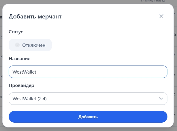 В панели управления откройте раздел "Мерчанты и API — Список мерчантов", и справа в углу нажмите кнопку "Добавить мерчант"