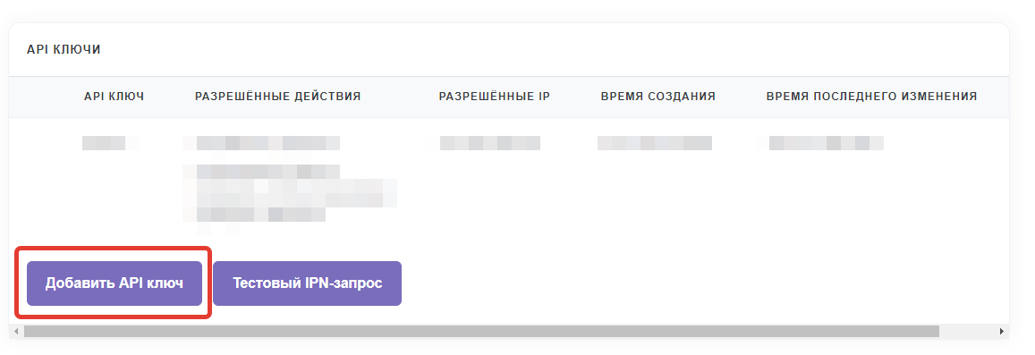 В разделе "API КЛЮЧИ" нажмите кнопку "Добавить API Ключ"