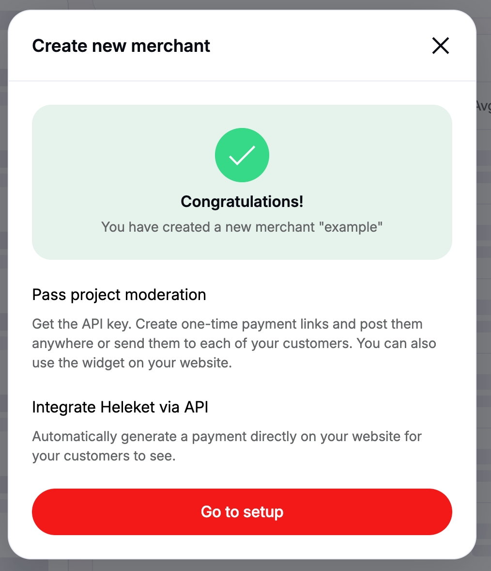После создания мерчанта, необходимо перейти к настройкам нажав на "Go to setup"