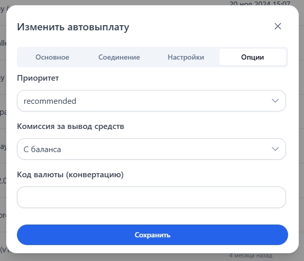 Комиссия за вывод средств — выберите из списка тип комиссии