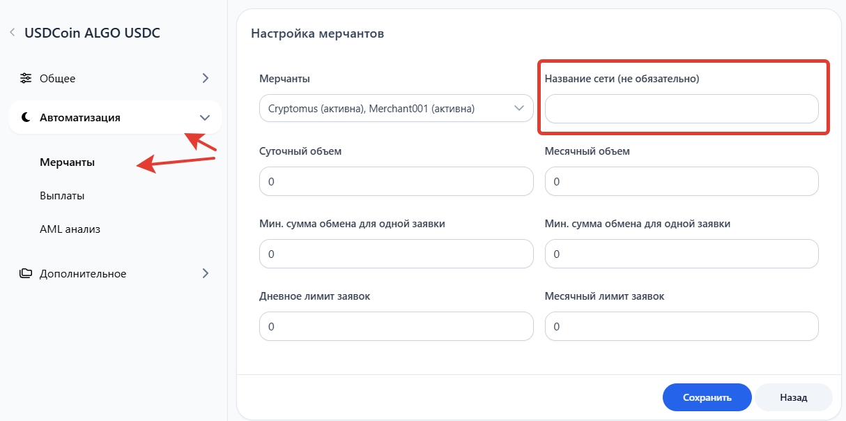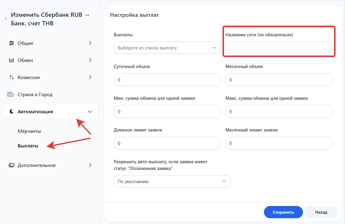 Откройте раздел "Автоматизация — Выплаты" и пропишите в поле "Название сети (не обязательно)" значение для определения сети к которому относится настраиваемая валюта. (Например: usdt-tron, usdttrc ...)