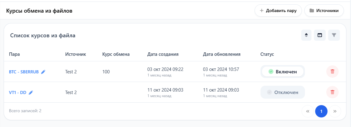 Статус — Установите статус пары. Пары с отключённым статусом не будут автоматически обновляться и использоваться в расчётах.
