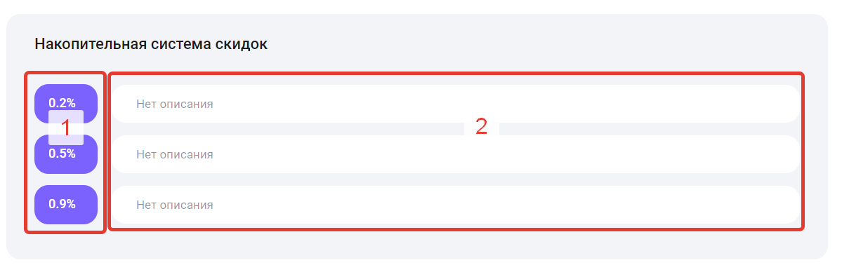 Описание — пояснение условий получения скидки (например: «Скидка при обмене от 2000 RUB»).