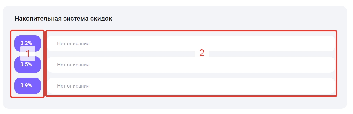 Создавайте несколько уровней скидок (например: 0.2% от 0, 0.5% от 2000, 0.9% от 10000).