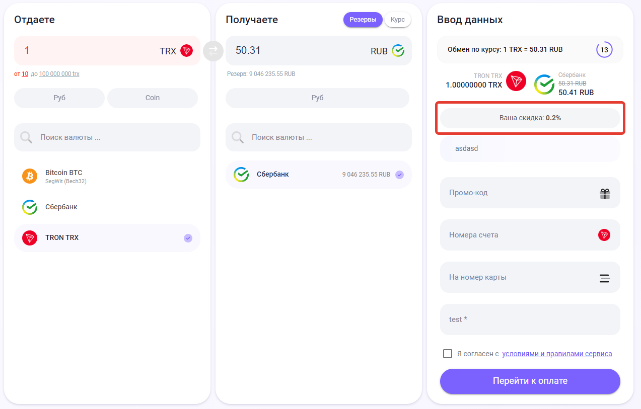 Если сумма обмена и условия соответствуют настройкам, клиент видит строку «Ваша скидка: X%».