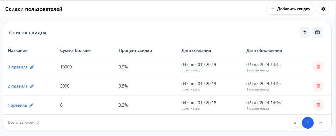 В разделе «Партнёрам и скидки — Скидки» отображается таблица с уже созданными скидками: