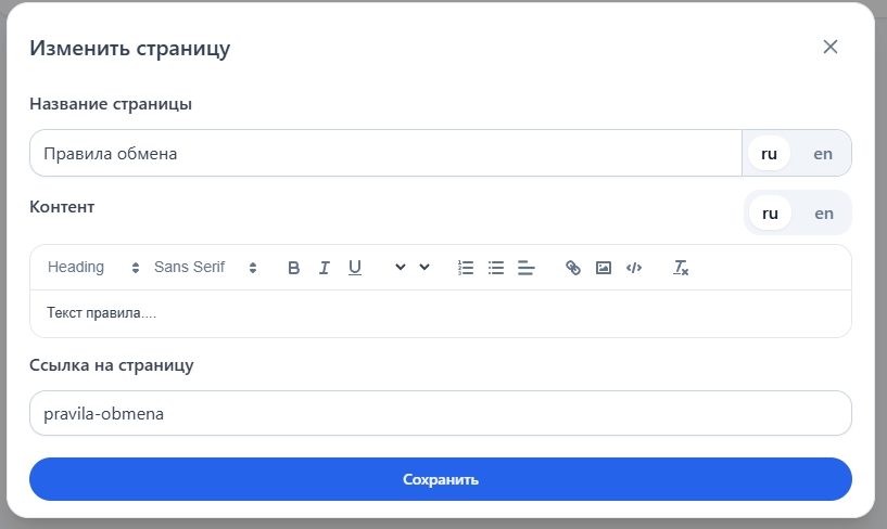 Создавать новые страницы, задавая их заголовки, содержание и ссылки (URL).