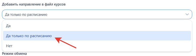 «По расписанию» — Направление обмена отображается в XML и TXT файлах строго в указанные часы (например, с 10:00 до 22:00), в остальное время оно будет скрыто.