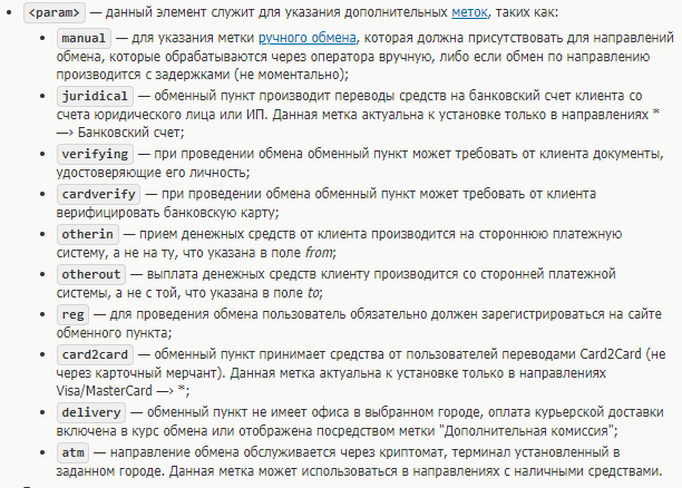 Метки для параметра param — Используйте это поле, чтобы вручную задать дополнительные метки, которые будут отображаться в параметре param в XML-файле с курсами. Метки должны соответствовать требованиям и рекомендациям BestChange.