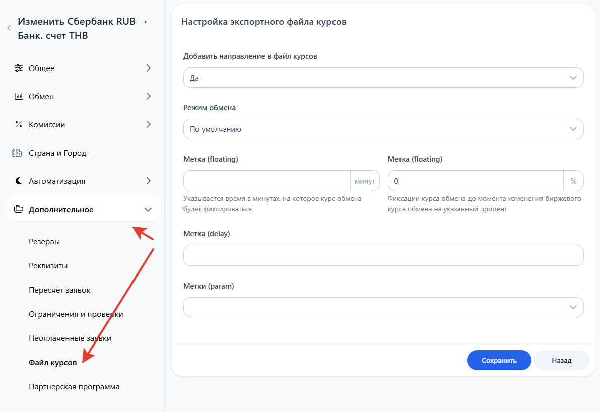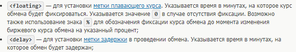 floating — установите эту метку, если направление обмена работает с плавающим курсом (подробнее о метке). В поле укажите время (в минутах), на протяжении которого курс будет фиксироваться для клиента после создания заявки. Если курс не фиксируется, оставьте это поле пустым.