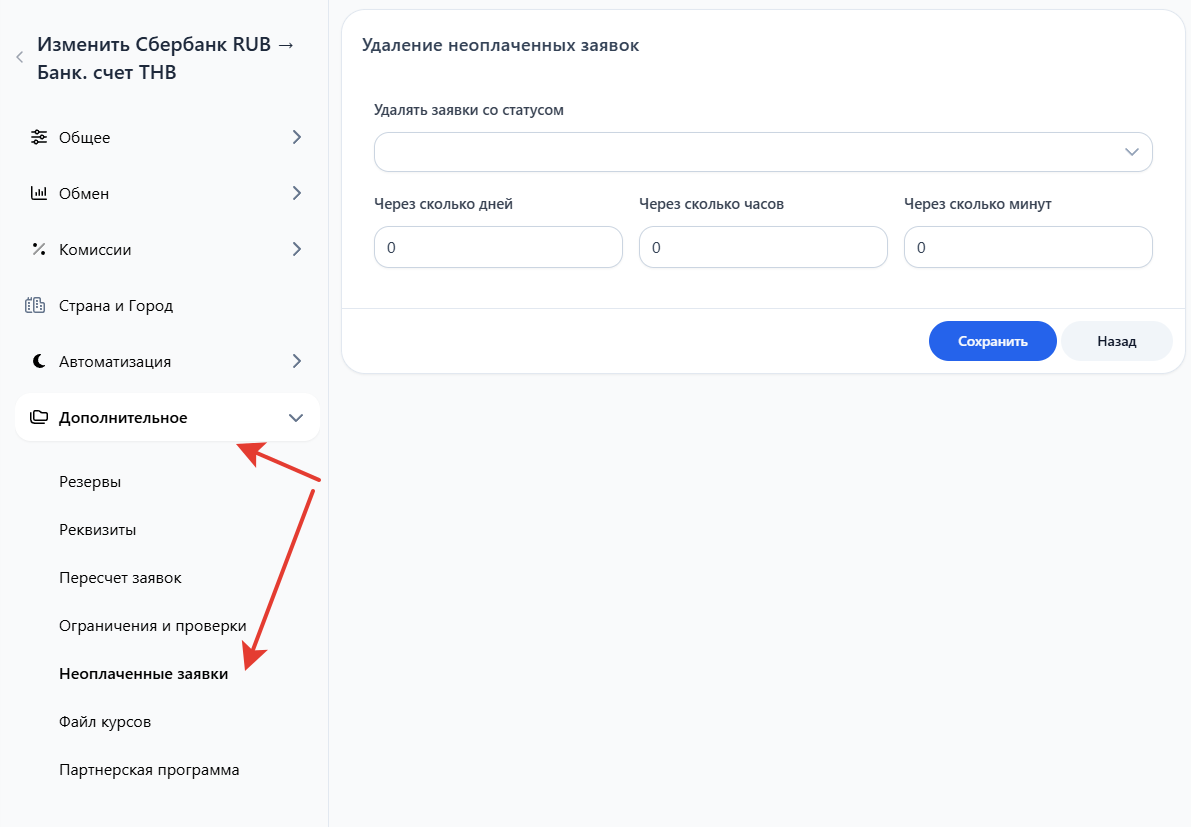 Через сколько дней/часов/минут — При необходимости вы можете задать индивидуальное время, после истечения которого неоплаченные заявки будут удаляться автоматически.