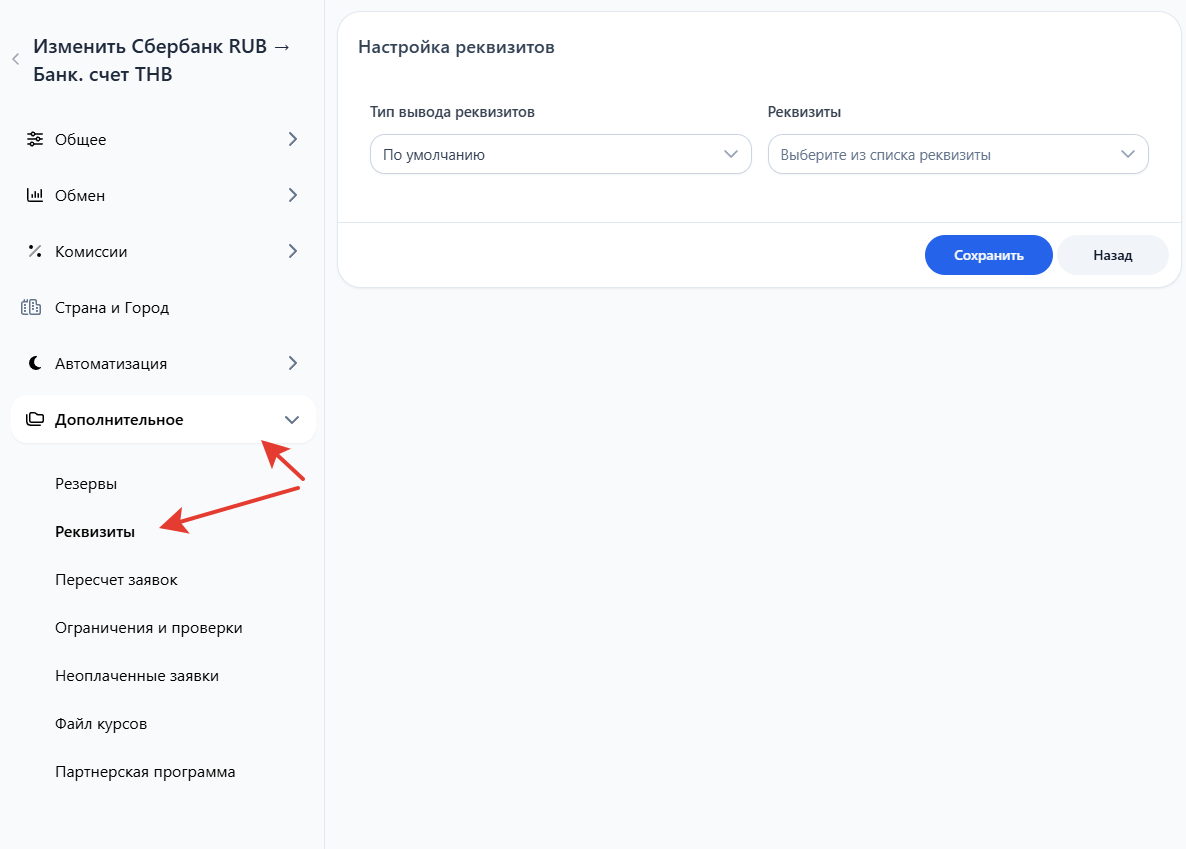 Реквизиты для направлений можно создать в разделе "Основное — Направления обмена — Реквизиты"