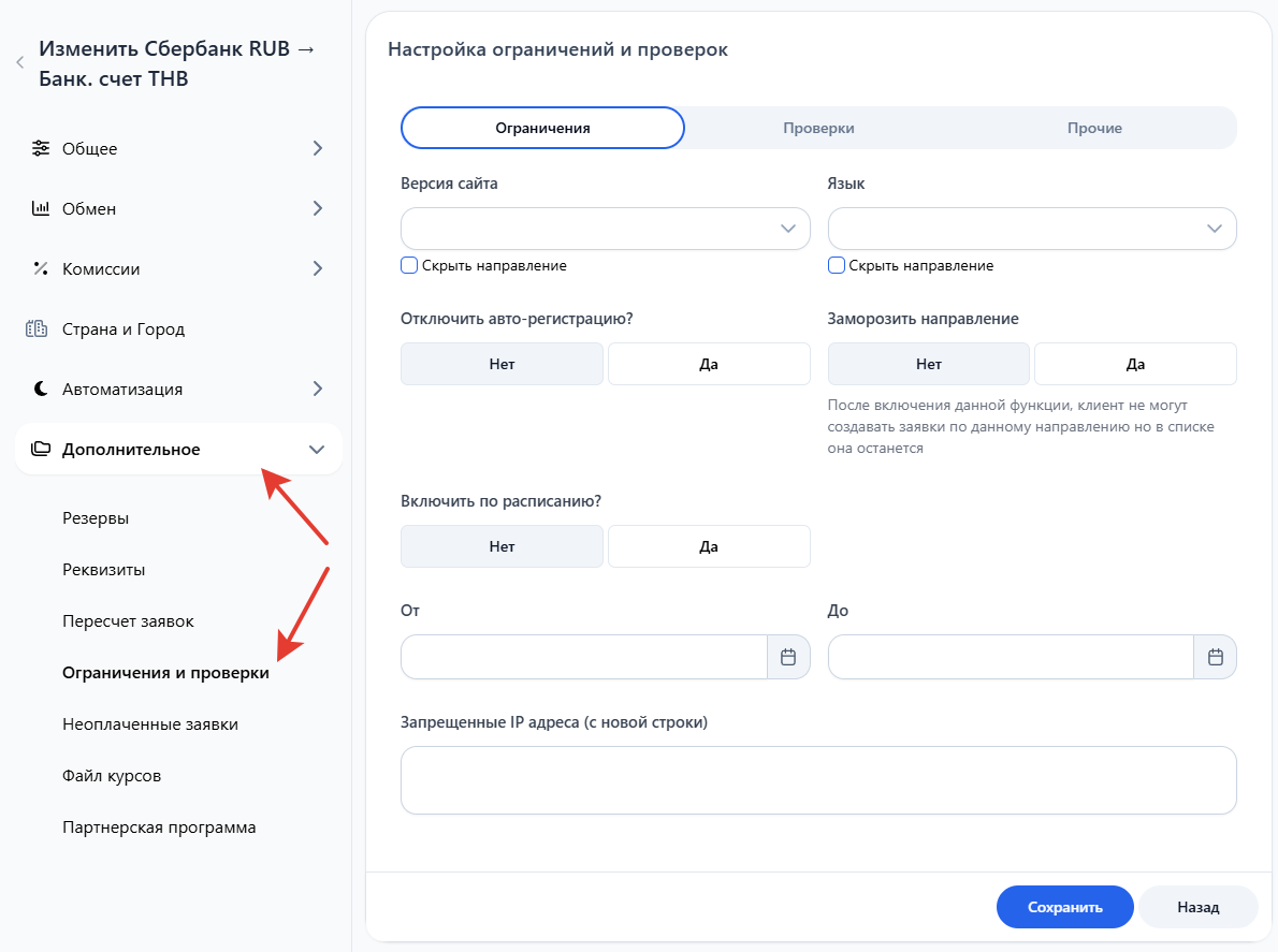 Именно в этом разделе администратор определяет, какие комбинации валют работают между собой, задаёт комиссии, лимиты, условия обработки и дополнительные параметры. Без настроенных направлений клиенты не смогут создавать заявки на обмен.