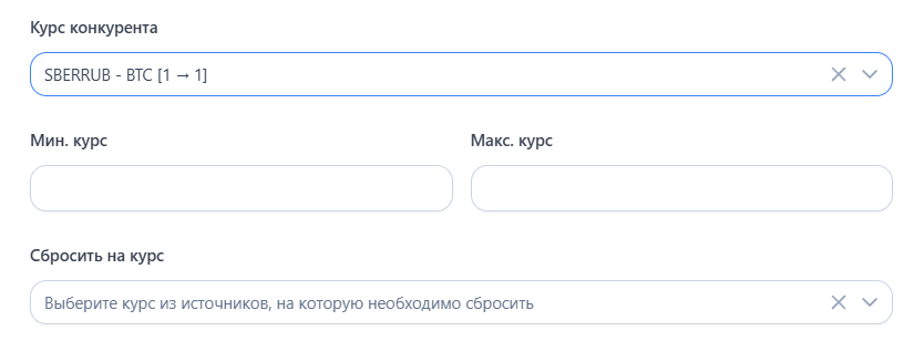 Мин. курс/Макс. курс — При необходимости вы можете указать диапазон допустимых значений курса, в рамках которого будет работать парсер курсов, подключённый к направлению обмена.