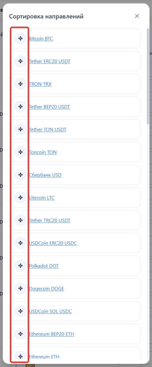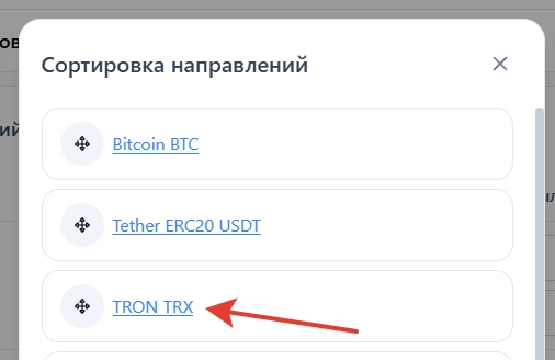 Для сортировки направлений, откройте раздел "Основное — Направление обмена — Список направлений