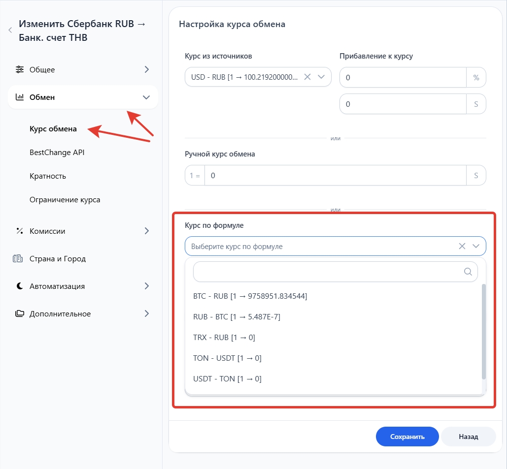 Используя формулы для расчёта курсов, вы можете привязать их к конкретным направлениям обмена. Это позволит автоматически рассчитывать и отображать актуальный курс для ваших клиентов.