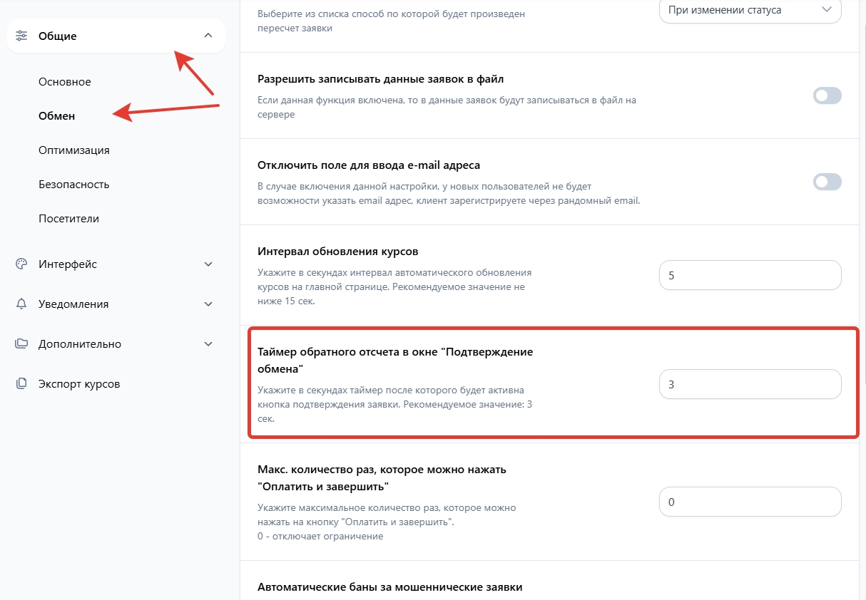 Перейдите в раздел "Обмен" и в поле "Таймер обратного отсчета в окне "Подтверждение обмена"" укажите свое значение.
