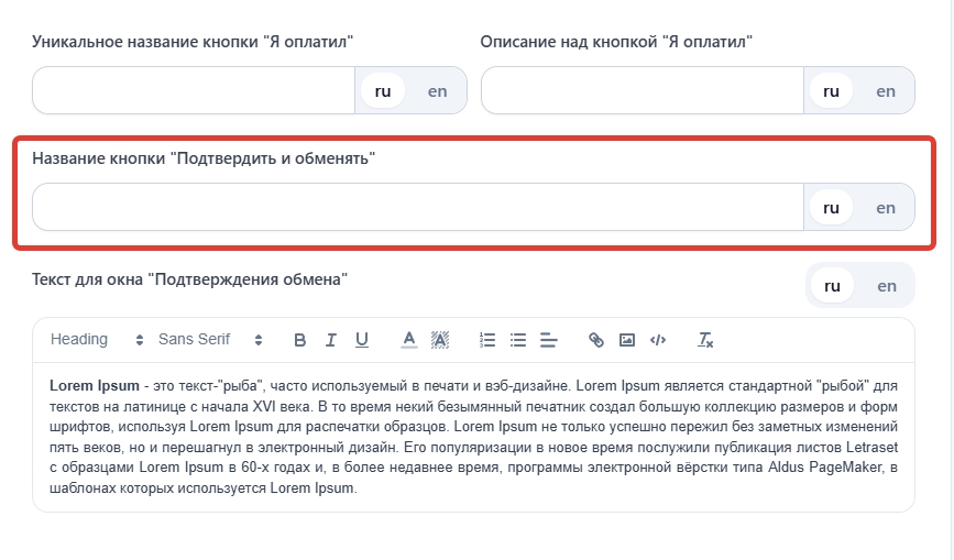 Далее перейдите во разделе "Информация", найдите "Название кнопки "Подтвердить и обменять"" и укажите свое название.